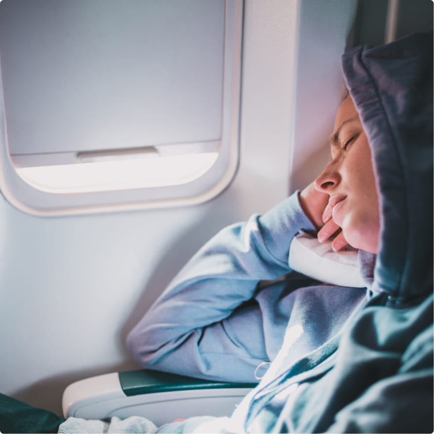 Think about elements of a healthy routine that promote better sleep: avoid caffeine and alcohol, switch off your electronics and stay hydrated. If you’re doing the things that signal to your brain it’s time to switch off, you’re more likely to enjoy some slumber on the flight. While it might be the default position for many of us, some travellers recommend avoiding resting your head on the tray table since it can irritate your skin and cause numbness. Instead, lean back in your chair and use an ergonomic pillow to ease the pressure on your neck and spine.