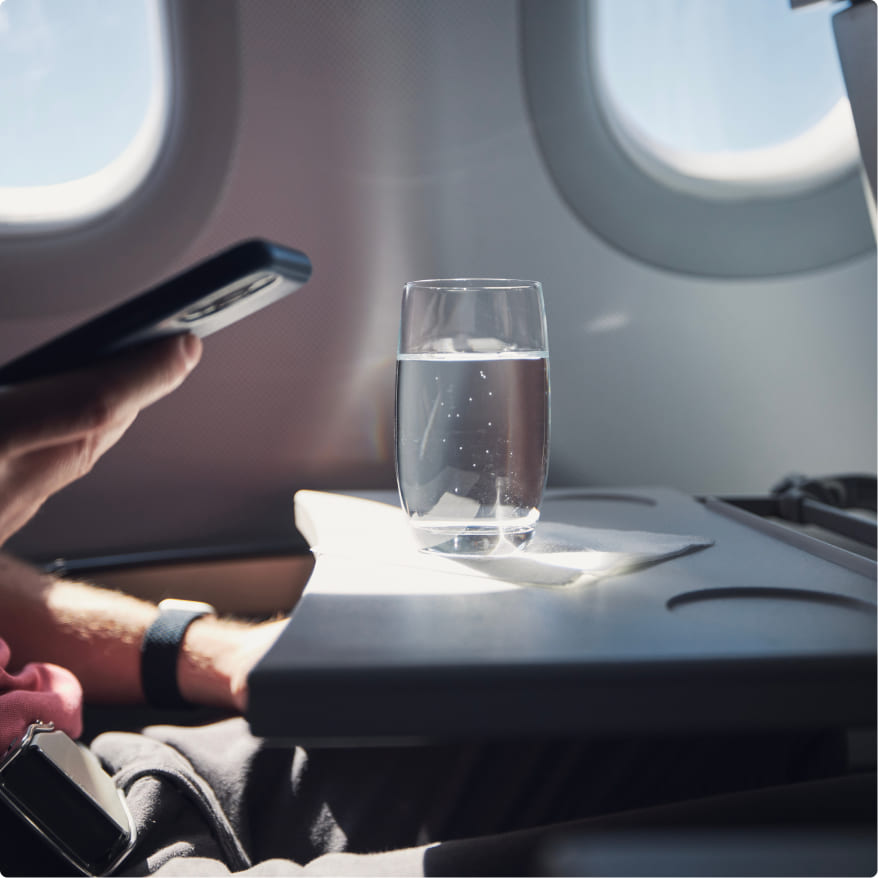 It’s recommended to pack a refillable water bottle that you can ask to be topped up during the flight. For an added boost of hydration, consider packing some dissolvable electrolytes, and avoid consuming alcohol before or during the flight.